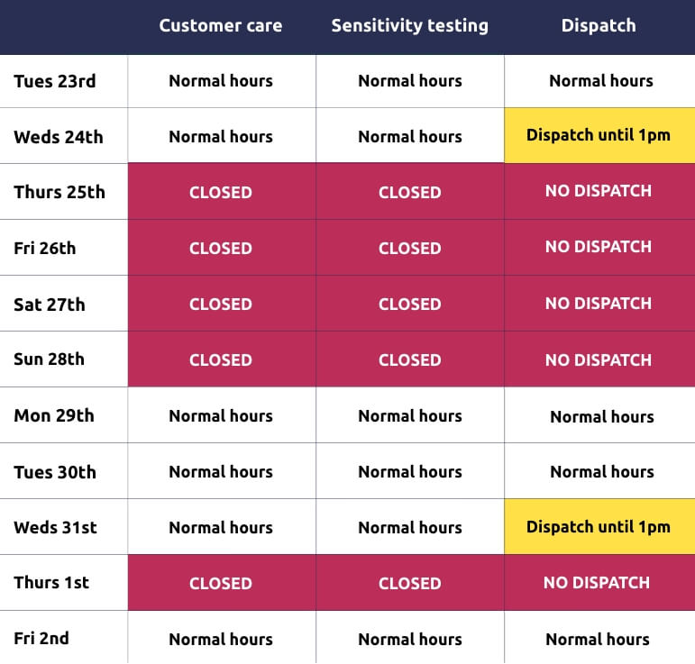 We’ll continue to dispatch orders on all open business days, but anything placed after this deadline will follow Royal Mail’s delivery schedule.